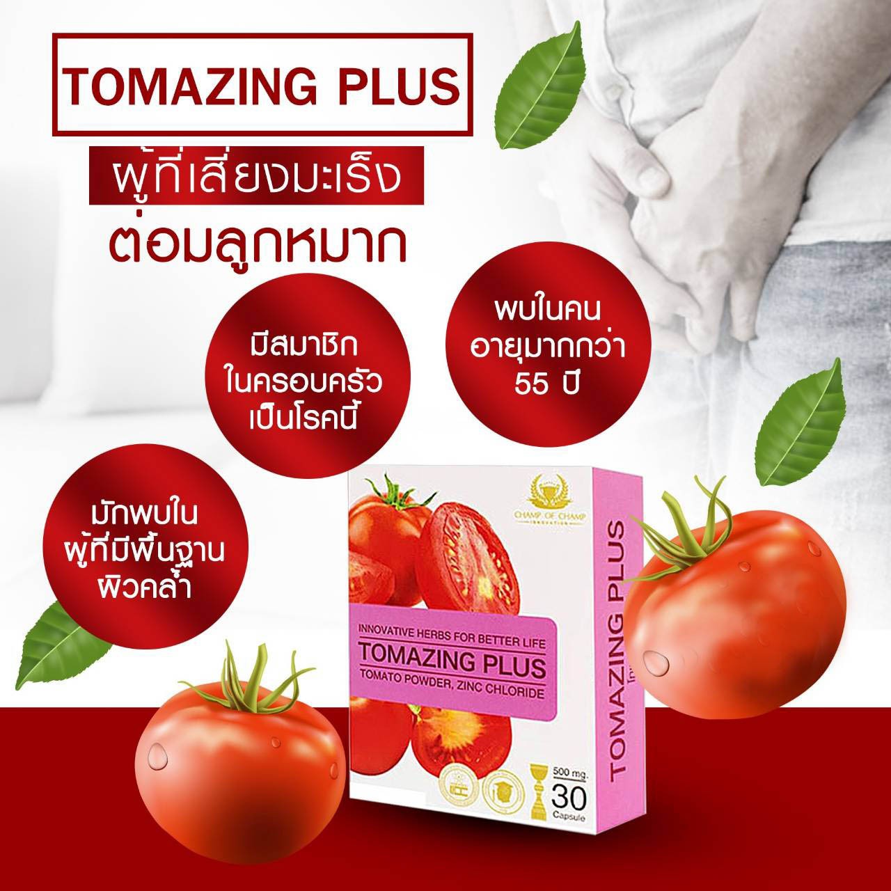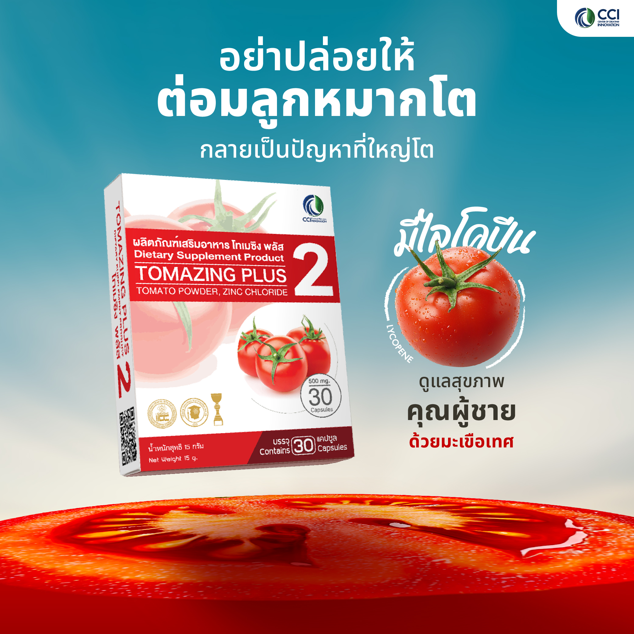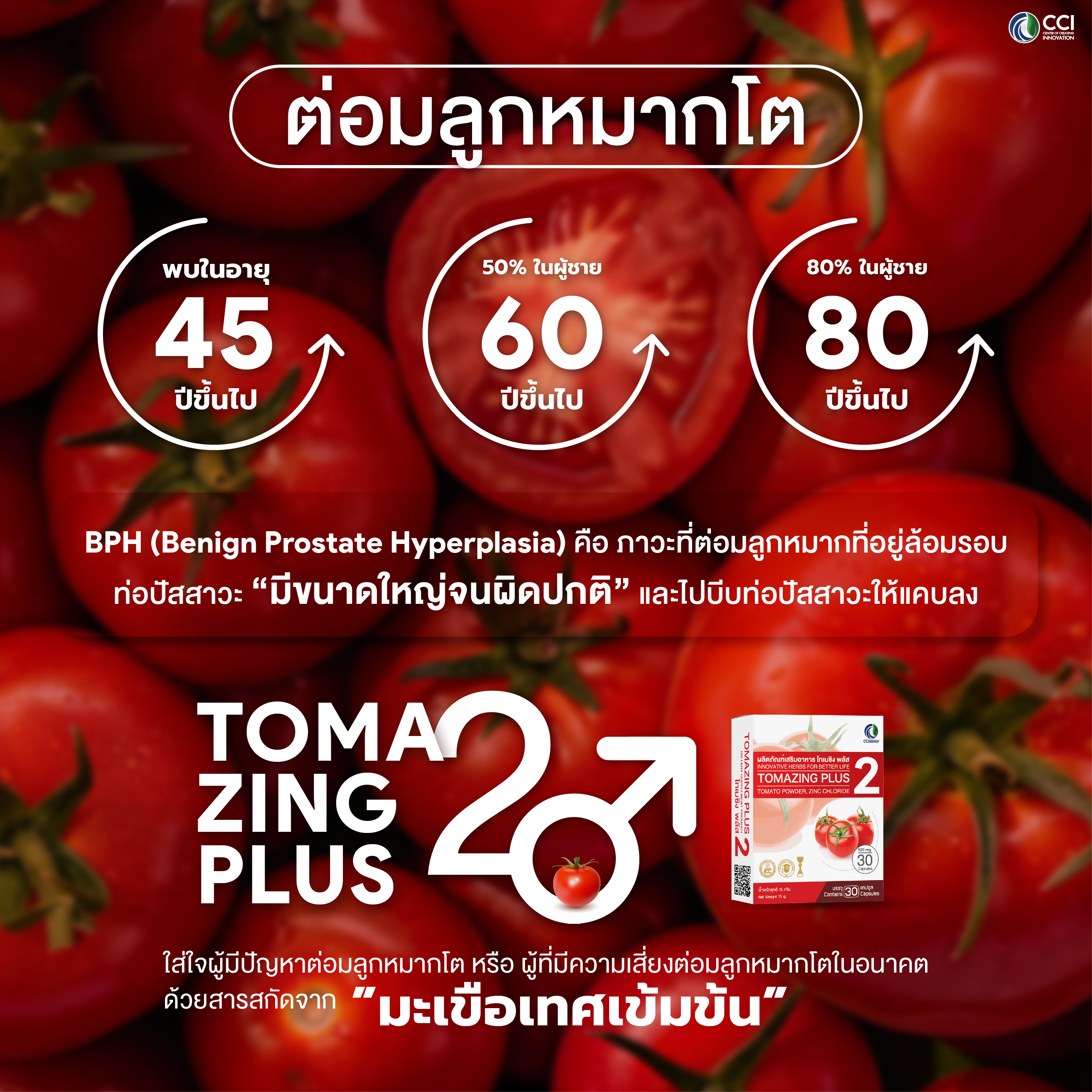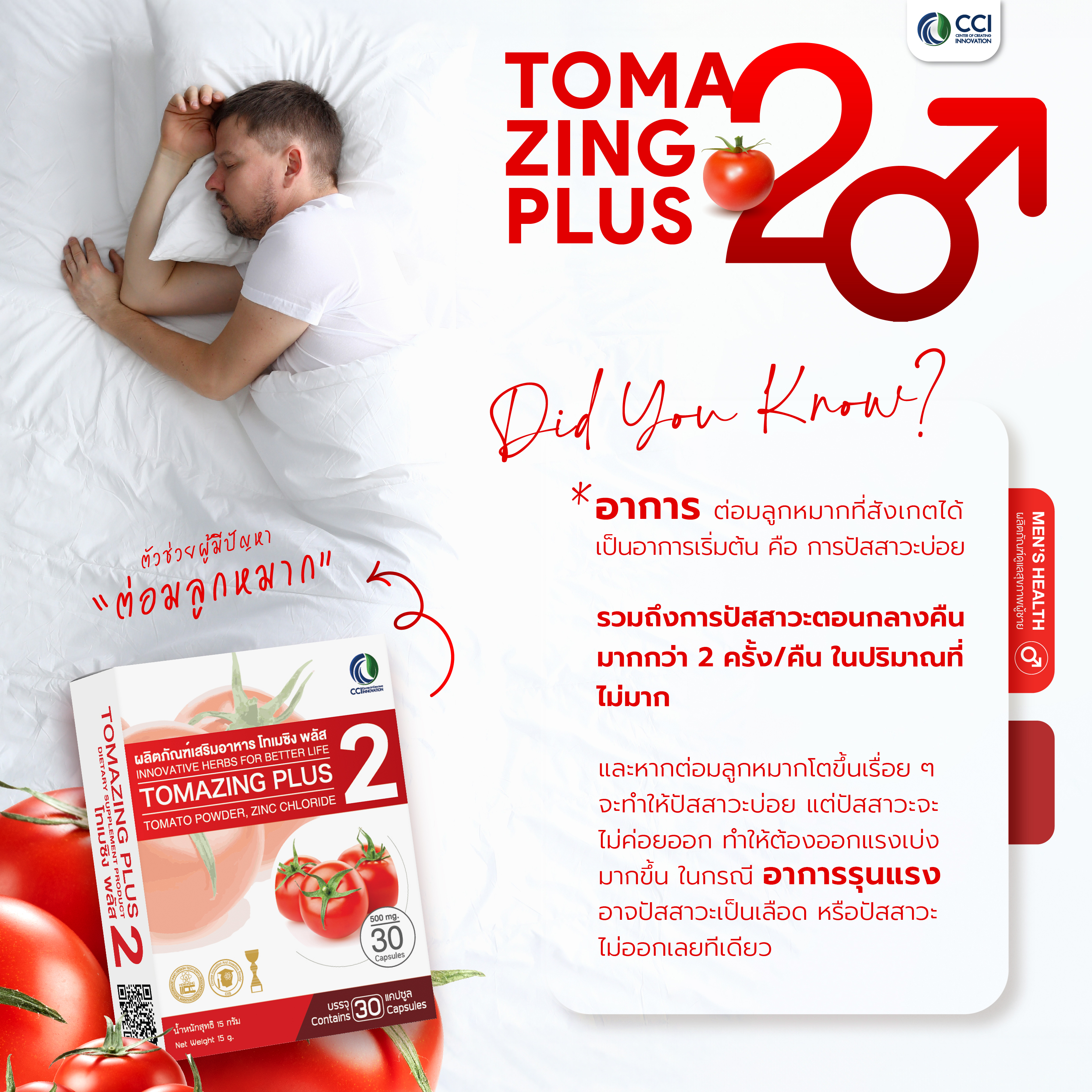 TOMAZING PLUS2 มีสารสกัดจากสมุนไพรธรรมชาติ ซึ่งได้ผลในการช่วยเรื่องต่อมลูกหมากโตอย่างชัดเจนมากๆสารสำคัญเหล่านั้นได้แก่…สารกลุ่มไลโคปีน (LYCOPENE) ซึ่งเราสกัดสารสำคัญจากส่วนเปลือกของมะเขือเทศ จะช่วยเรื่องต่อมลูกหมากโตได้ดีมากๆ และยังมีสารพวกซิงค์ (ZINC) รวมถึง (กลุ่มวิตามินบี Vitamin B) จะยับยั้งกระบวนการจับตัวกันของเอนไซม์ไฟว์อัลฟ่า รีดัคเทส ไทพ์ทู (5-Alpha Reductase Type 2) กับฮอร์โมนเทสโทสเตอโรน (Testosterone) จึงทำให้ไม่เกิด ไดไฮโดรเทสโทสเตอโรน(Di–Hydrotestosteroneหรือ DHT) ซึ่งเป็นสาเหตุหลักของต่อมลูกหมากโต ส่งผลให้ต่อมลูกหมากไม่โตขึ้น คลายการบีบท่อปัสสาวะ ทำให้อาการปัสสาวะขัดค่อยๆดีขึ้น ต่อมลูกหมากค่อยๆเล็กลงจนเป็นปกติ และจะช่วยลดความเสี่ยงในการเกิดมะเร็งต่อมลูกหมากได้ดีอีกด้วย